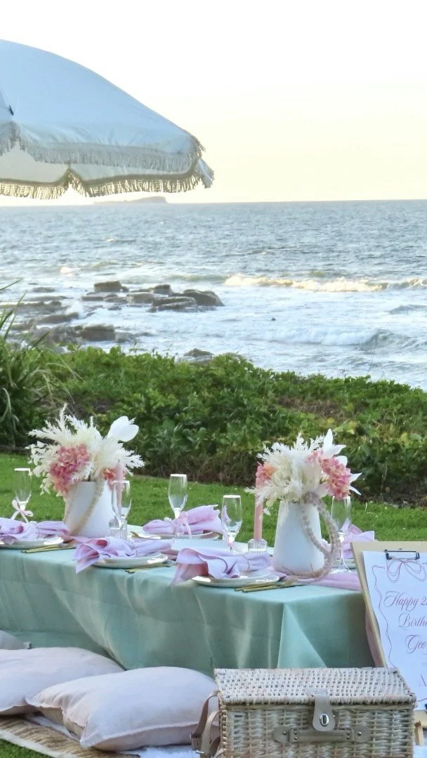 Our signature service offers a beautiful, stress-free luxury picnic experience tailored for birthdays, events, and special gatherings. You simply show up and enjoy—while we take care of every detail: planning, setup, styling, and pack-down. Designed for up to 16 guests, our dreamy coastal escapes are crafted to connect and celebrate in unparalleled style. Every moment is carefully curated to deliver intimacy, luxury, joy, and effortless beauty.